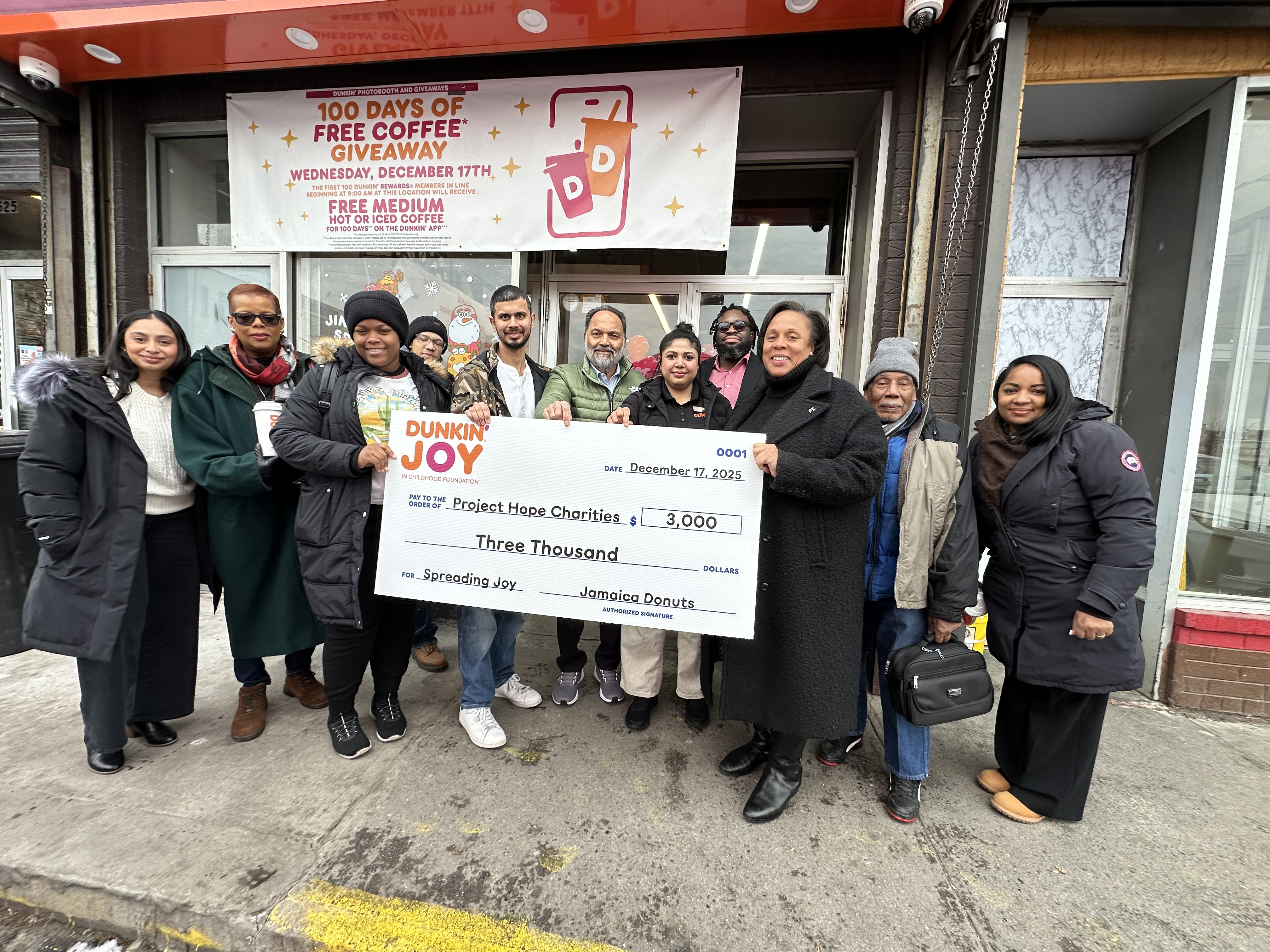 The grand reopening of the Liberty Avenue Dunkin’ was commemorated by Dunkin’ franchisee Jamaica Donuts through a $3,000 donation to Project Hope Charities, in conjunction with the Dunkin’ Joy in Childhood Foundation. A humanitarian and community-based organization, Project Hope Charities offers numerous services for the poor, low-income, working poor and homeless in the Jamaica community and across Greater New York City.