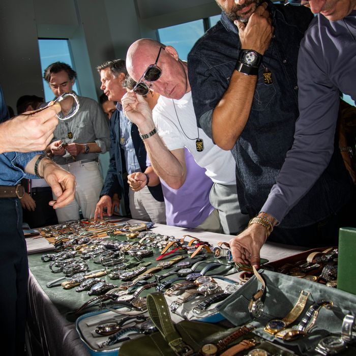The rarest sight of all are female collectors. “I’m always in awe of any woman who shows up here because it’s Dungeons & Dragons–level nerdery,” says Toledano. The ones I talk to are type-A shebosses working for auction houses, in public relations, and for microbrands. They can express themselves in a way the glaringly heterosexual men simply can’t and are likely wearing tiny cool-girl watches. Courtney Bachrach, a collector and consultant, shows me a snakelike 1940s Cartier bracelet ($12,000 to $16,000) with four intertwined ropes of gold cradling a modest dial that feels the most appropriate for this haunting Egyptian atrium.