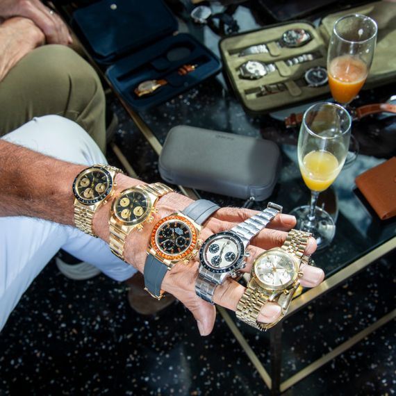 At a lunch on the second day, collectors displayed millions of dollars’ worth of watches. A Rolex Daytona 6241 ($350,000), a Rolex Daytona 6265 ($200,000), a Rolex Daytona 116588SACO ($300,000), a Rolex Daytona 6241 ($350,000), and a Rolex Pre-Daytona 6238 ($150,000). All prices are estimates. Photo: Brian Finke for New York Magazine.