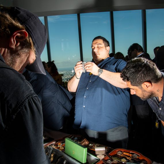 Ascending to the 102nd floor, I find a sun-drenched horological bacchanal. A long table covered in Breguets, Rolexes, Patek Philippes, Audemars Piguets, and Universal Genèves stretches down the center of the room. As if it’s a grown-up playdate, attendees bring their favorite LEGOs from home, dump them on the table, and leave to mingle. I approach the bounty, running my unsupervised median-income paws over millions of dollars’ worth of merchandise — gold, silver, diamond encrusted, leather banded, vintage, indie, brand new. Whoever owns the gems I’m sweating on simply does not care. They’re among friends. They trust me now.