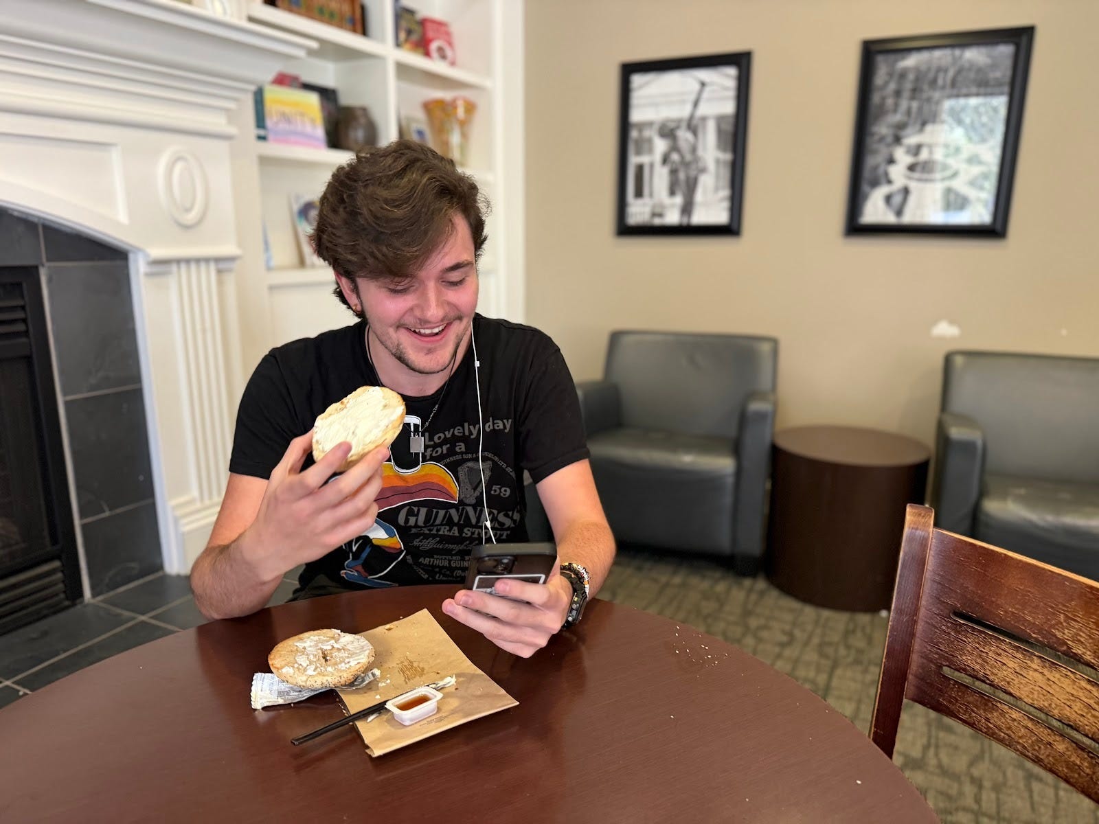 Eammon Dunn, a freshman graphic design major at Queens University, seen here at a popular spot for students on campus called The Coffee House, says he’s “a little bit annoyed” by the planned merger with Elon University. (Photo: Rachel Black for The Charlotte Ledger)