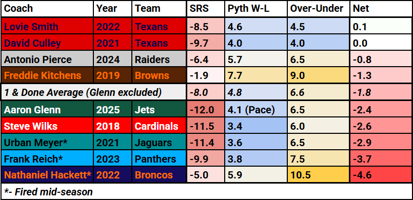 Glenn’s output in 2025 justifies a one-and-done season. The Jets’ -12.0 SRS is worse than each of the eight head coaches to go one-and-done (fired during or after their first season with a team) since 2018: Freddie Kitchens (-1.9), Nathaniel Hackett (-5.0), Antonio Pierce (-6.4), Lovie Smith (-8.5), David Culley (-9.7), Frank Reich (-9.9), Urban Meyer (-11.4), and Steve Wilks (-11.5).