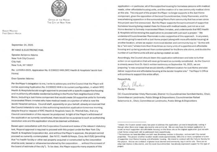 In a letter to the City Council, outgoing First Deputy Mayor Randy Mastro said Just Home would not proceed in the Bronx and would be relocated to Brooklyn.