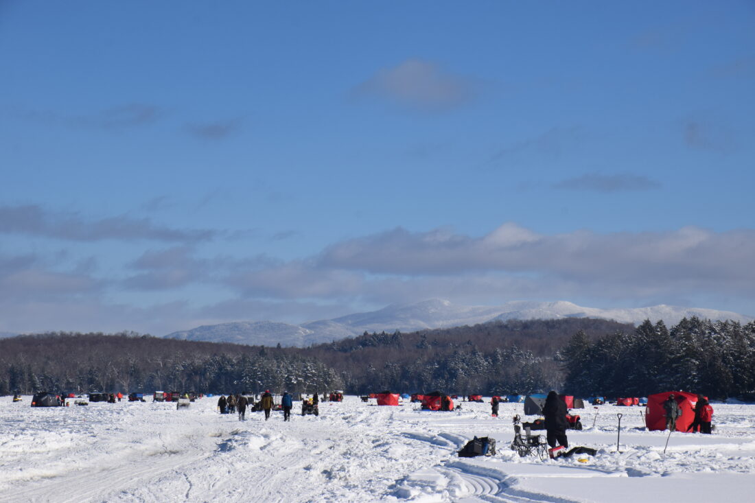A crisp winter’s day on Simon Pond for the Northern Challenge ice fishing dervy in Tupper Lake in February 2025. Seward, center, and Donaldson, right, mountains are seen in the background. The 2026 Northern Challenge will be held on Feb. 7. (News photo — Chris Gaige)