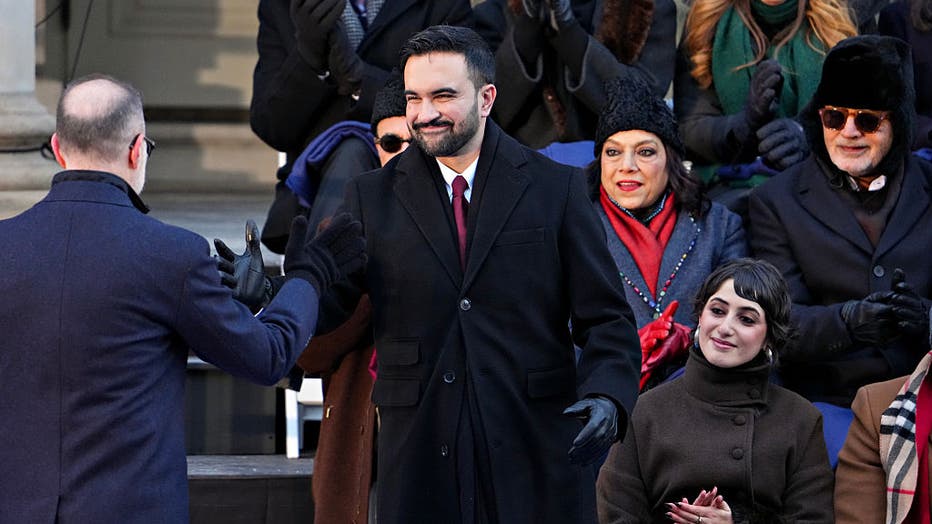 Zohran Mamdani, mayor of New York, center, shakes hands with Mark Levine, New York City comptroller, left, during an inauguration ceremony at City Hall in New York, US, on Thursday, Jan. 1, 2026. A 34-year-old democratic socialist born in Uganda, Mam