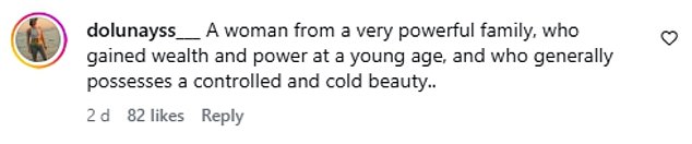 Taking to the comments, a follower wrote: ‘A woman from a very powerful family, who gained wealth and power at a young age, and who generally possesses a controlled and cold beauty.’