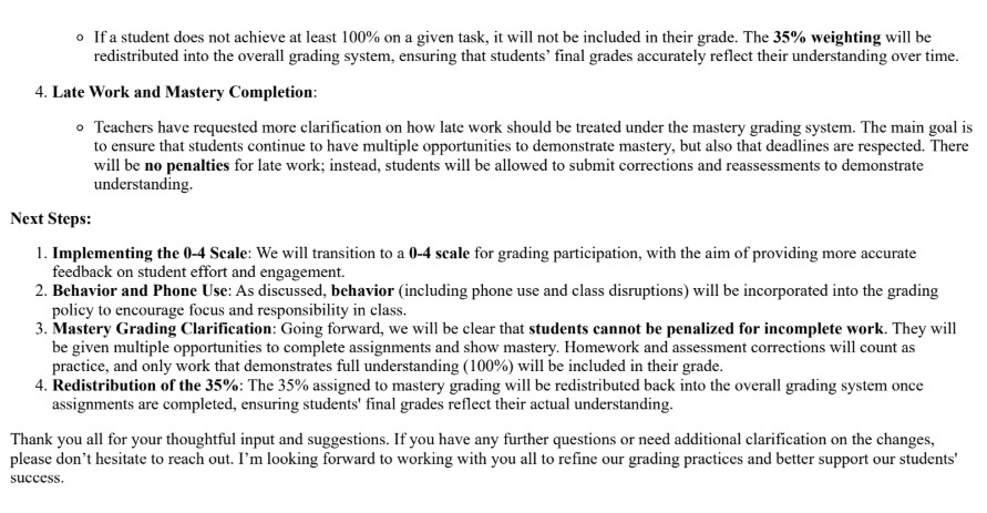 Last year’s mastery grading policy stated that students would be given multiple opportunities to complete assignments until they achieve mastery, with a focus on homework and assessment corrections. It also stated that any grades a student receives that are not 100 would not be included in their grade.