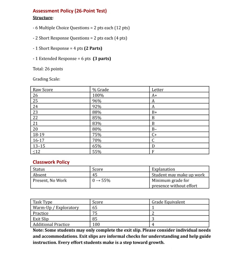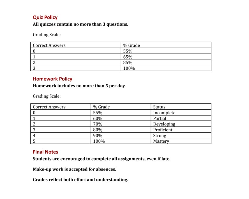 Classwork policy remained the same but included a few more task-driven evaluations, although quizzes are now graded on a scale of 1-3, with 0 still representing a 55 and 1 representing a 65, and homework is now graded on a scale of 1-5, with 0 representing a 55 and 1 representing a 60.