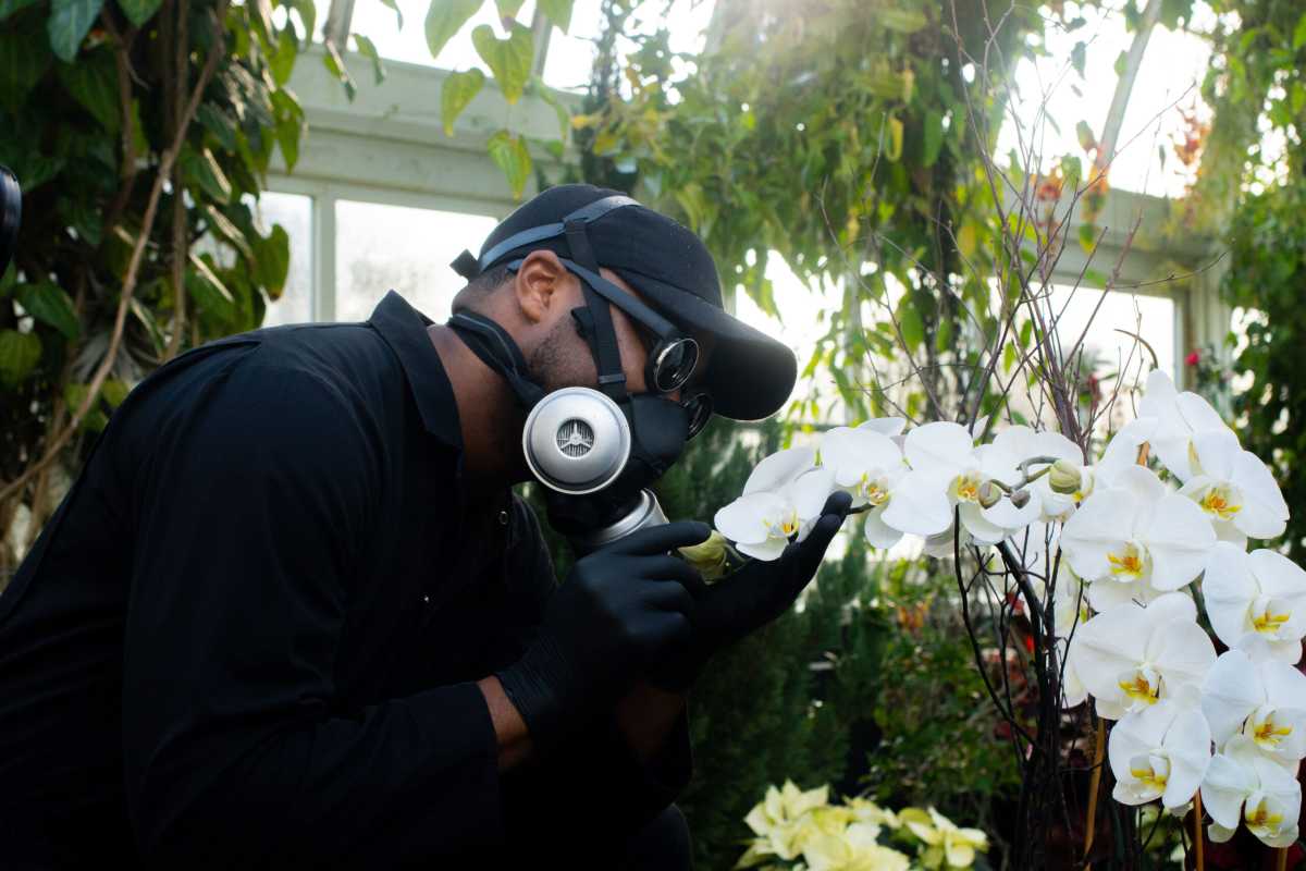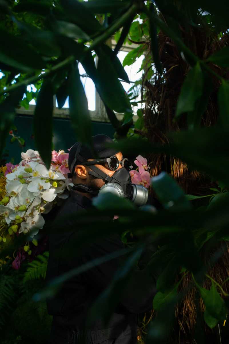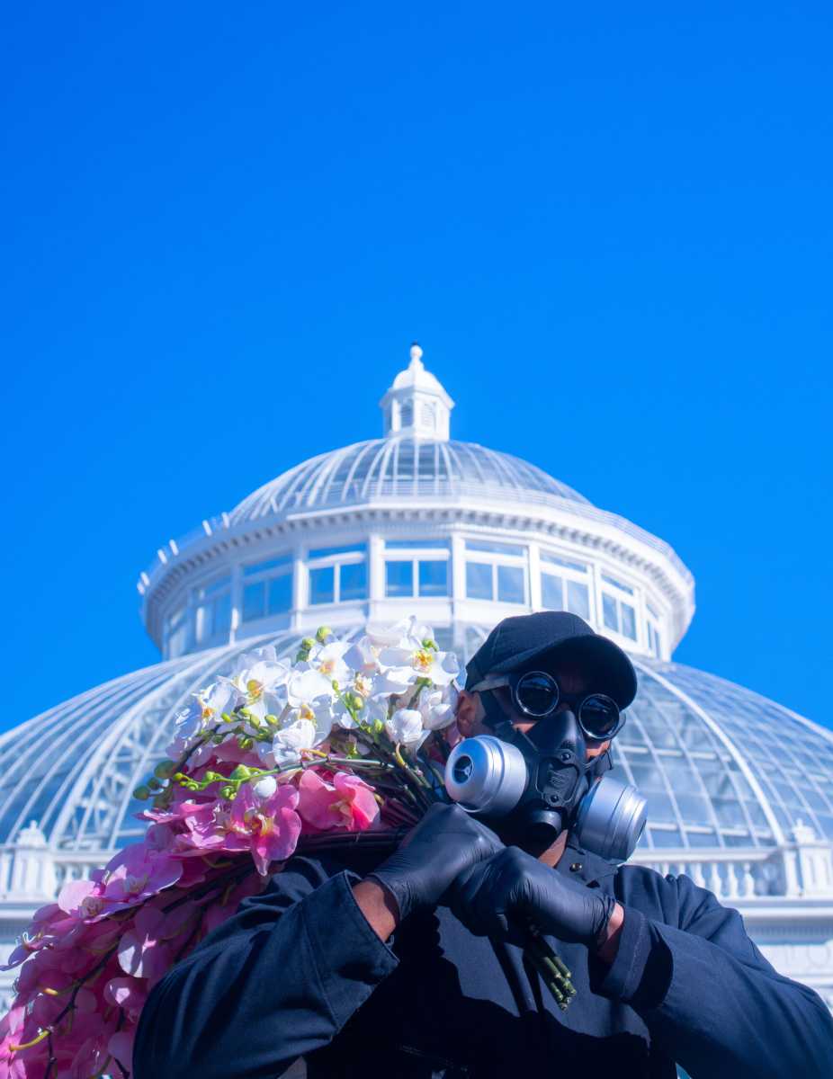 Mr. Flower Fantastic wears a mask and gloves to protect himself from his flower allergy, allowing for him to remain anonymous for practical reasons and to focus attention on his flower creations rather than himself. The Orchard Show will mark his first solo exhibition at an institution where he is able to expand beyond individual floral sculptures, creating an entire world for visitors to explore.