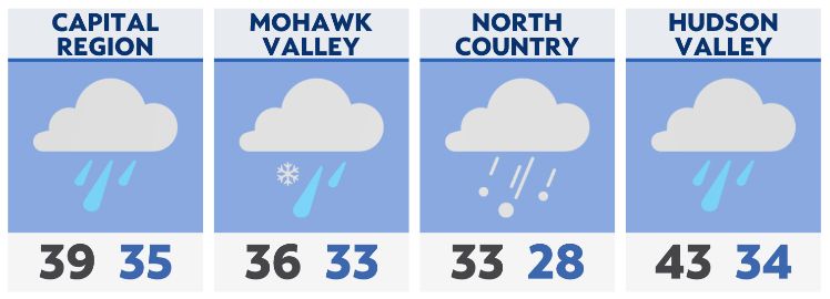 A Winter Weather Advisory continues until 11 a.m. in the hill towns outside the Mohawk and Hudson Valley. We have a murky start with foggy spots and a light mix of valley rain, higher elevation freezing rain, sleet and snow. The scattered wintry mix and rain tapers near lunchtime with temperatures reaching the 30s to near 40 degrees this afternoon.