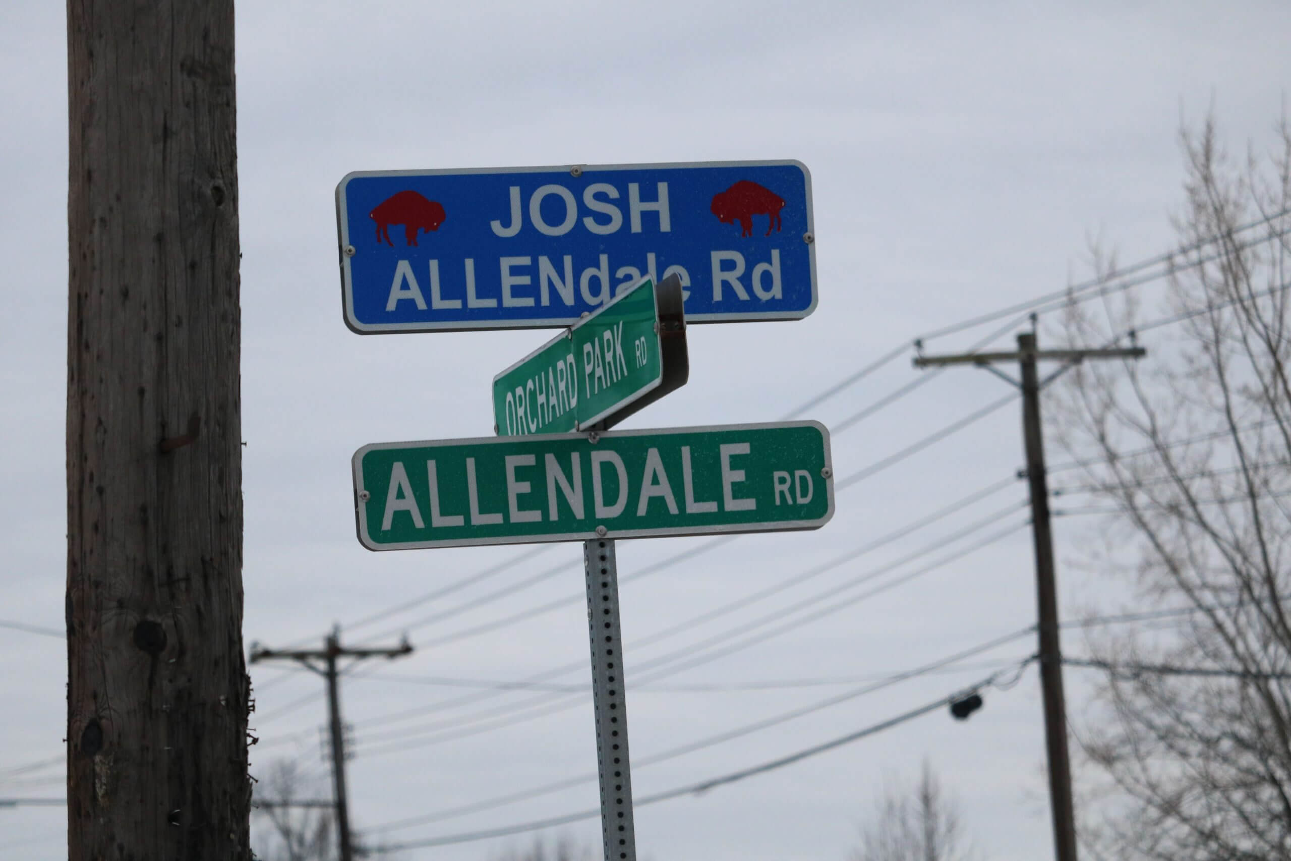 A street sign honoring Josh Allen was installed in the West Seneca suburb in Buffalo in 2021. (Joe Buscaglia / The Athletic)
