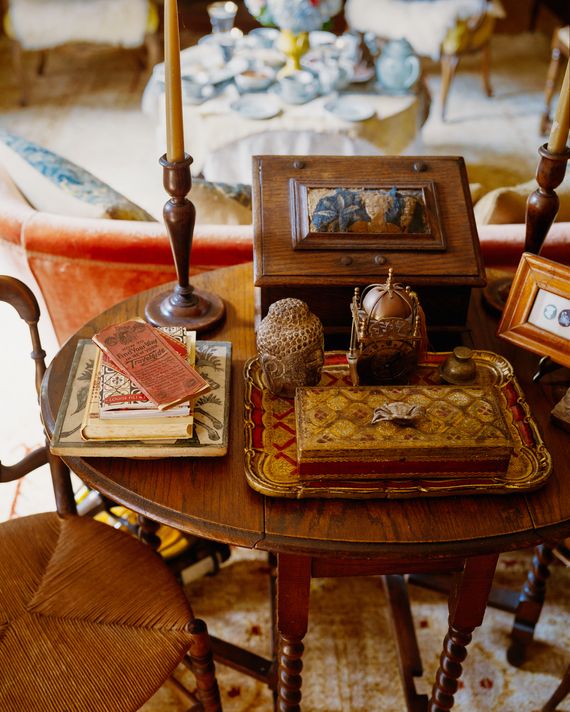 The Dining Area The gateleg table is from an antique shop in Massachusetts. The candlesticks are from the Lacquer Chest in London. The wooden box with the tapestry fragment is from San Francisco. “The painted tray I brought back from Venice,” Liotus says.
