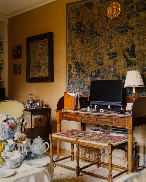 The Living Room The tapestries are from an antiques shop in Amsterdam and were framed at Eli Wilner & Company. The pair of Louis XVI chairs are from Silla Antiques & Art in Pennsylvania. The pelmet was found at an Upper East Side antiques show. “The coffee table was left by the previous owner,” Sandra Liotus says.