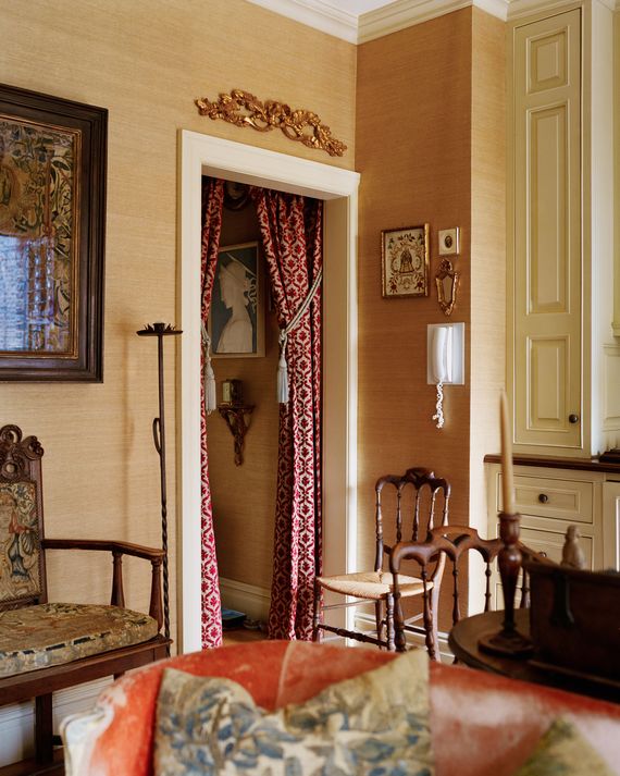 The Hallway The doorframe is draped with fabric from the Venice shop Ca’ Nova Tessuti e Tendaggi. The tapestry chair is from the Newport Show.