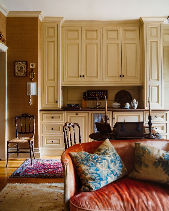 The Kitchen The millwork was in place when Liotus and her partner, David Crampton-Barden, found the apartment, as was the grass-cloth wallcovering in the living room.