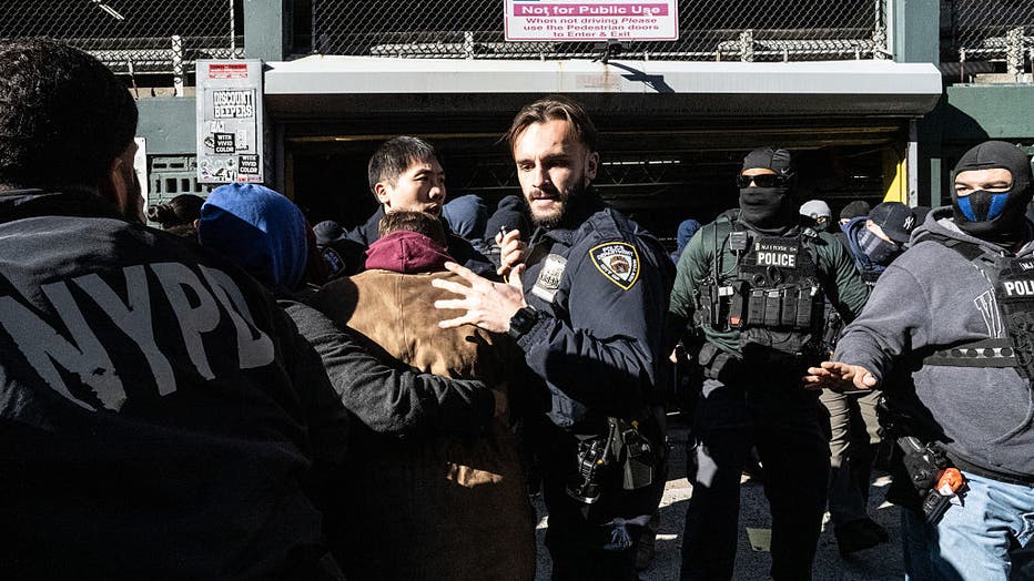 NEW YORK, NEW YORK – NOVEMBER 29: NYPD responds as immigration activists block a garage used by ICE vans during a protest against a purported ICE raid on Canal Street on November 29, 2025 in New York City. Activists assembled outside of a garage used