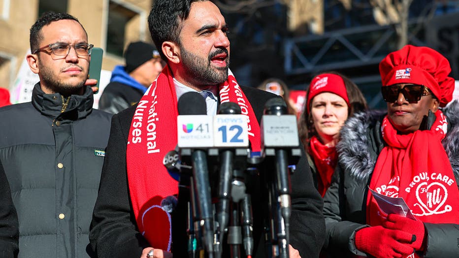 NEW YORK, NEW YORK – JANUARY 12: Mayor Zohran Mamdani speaks during a press conference as nurses from New York-Presbyterian/Columbia University Irving Medical Center strike outside the hospital on January 12, 2026 in New York City. Nearly 15,000 nurs