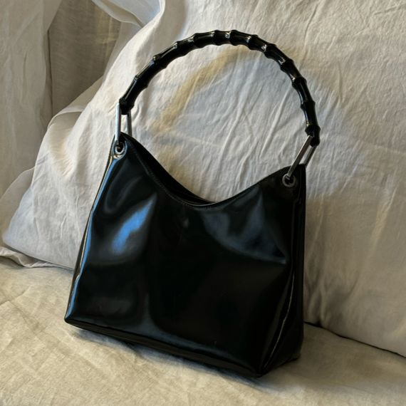 Patent leather in good condition with some interior rubbing; exterior consistent with vintage bag wear. Submitted by Alexis Badiyi, stylist.
