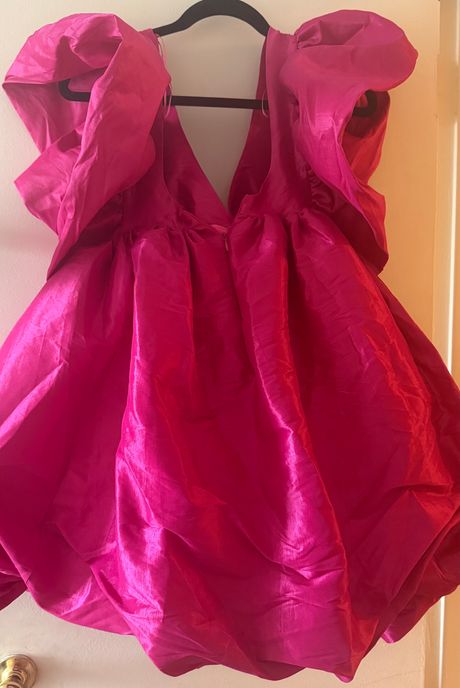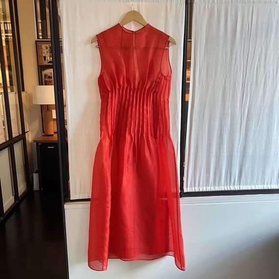 Size 0. Lightweight silk organza with pintuck pleats at the waist. Slip included. Worn once for a photo shoot; I plan to donate proceeds to Ali Forney Center. Submitted by Christine Gachot, designer.