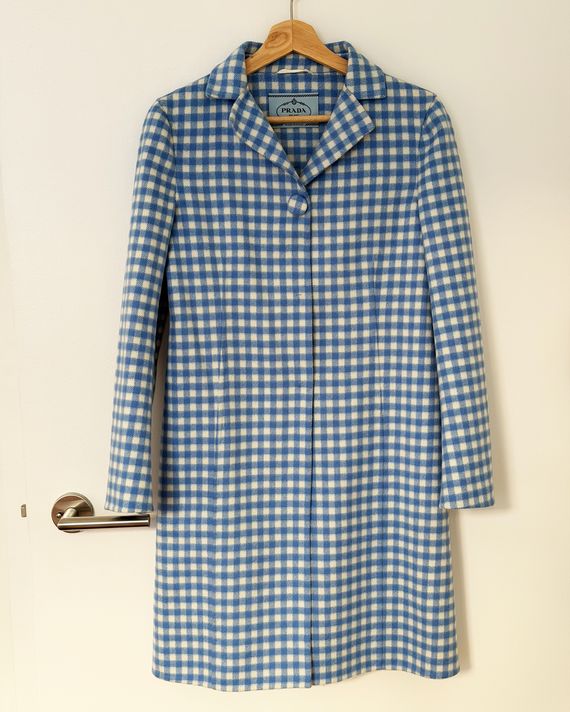 Size IT 38. Blue-and-white wool Vichy coat from Prada’s fall 2013 collection. As seen on Miuccia Prada in a picture in The Guardian. Submitted by Tasnim Ahmed, writer.