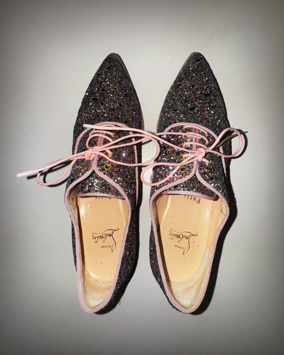 Size 39. My first pair of designer shoes after moving to New York, received as a gift at the end of an internship. Extremely sparkly and ready for a new home. Submitted by Emily May Jampel, filmmaker.