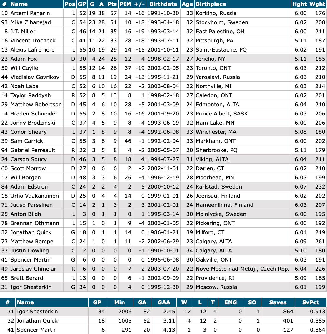 Injured Reserve: Conor Sheary, Adam Fox, Adam Edstrom, Igor Shesterkin