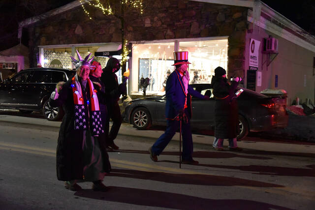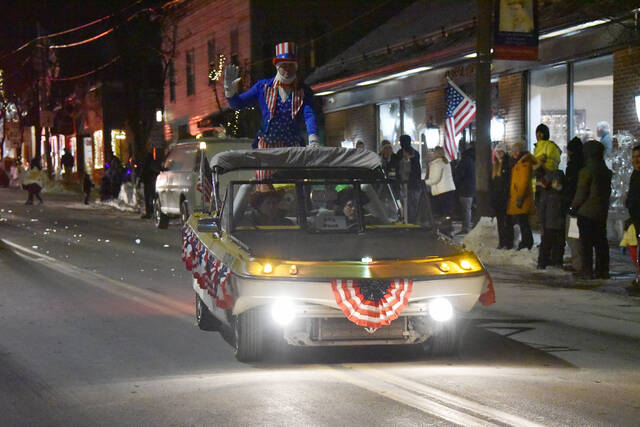 Clarks Summit Borough Council President Gerrie Carey gives a thumbs up to the small but enthusiastic crowd during Friday evening’s Clarks Summit Festival of Ice kick-off parade.