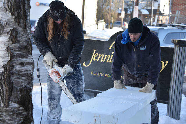 Sculpted Ice Works carvers prepare ice blocks for carving outside Jennings Calvey Funeral and Cremation Services Inc. on Friday afternoon.