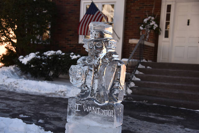 <p>An Uncle Sam ice sculpture sponsored by Lawrence E. Young Funeral Home declares, ‘I want you!’</p>