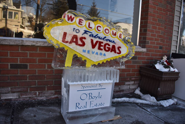 A colorful Las Vegas ice sculpture is displayed outside O’Boyle Real Estate.
