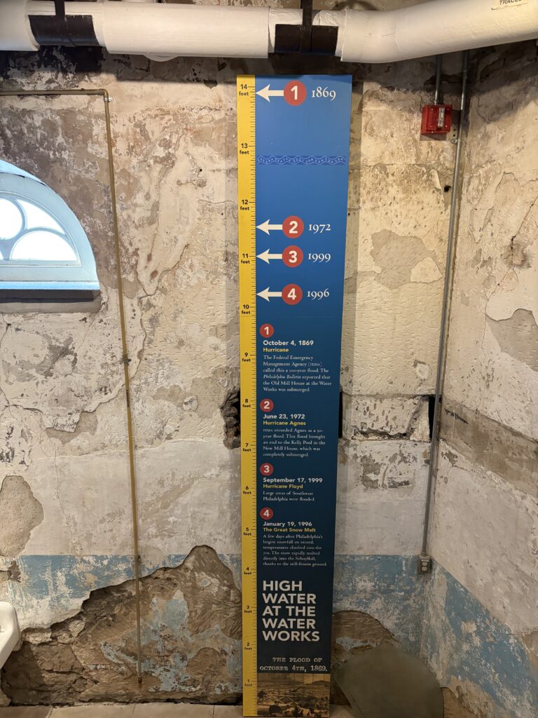 The damage from Ida is still visible at the Water Works today. Temporary wood paneling covers doorways that have not yet been repaired, and staff use space heaters to stay warm in the winter. There is rust on the legs of some of the exhibits, remnants of the flood. Wiggly blue stickers with Ida written on them are taped around the center, marking the high points of the flood: in the stairwell, on the wall, on a column just below the ceiling.