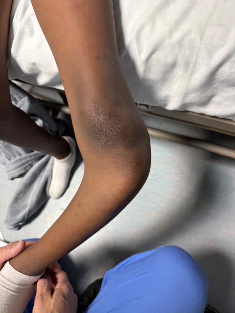 The boy’s knee, post-surgery. (Credit: Douglas Lundy/St. Luke’s University Health Network)
