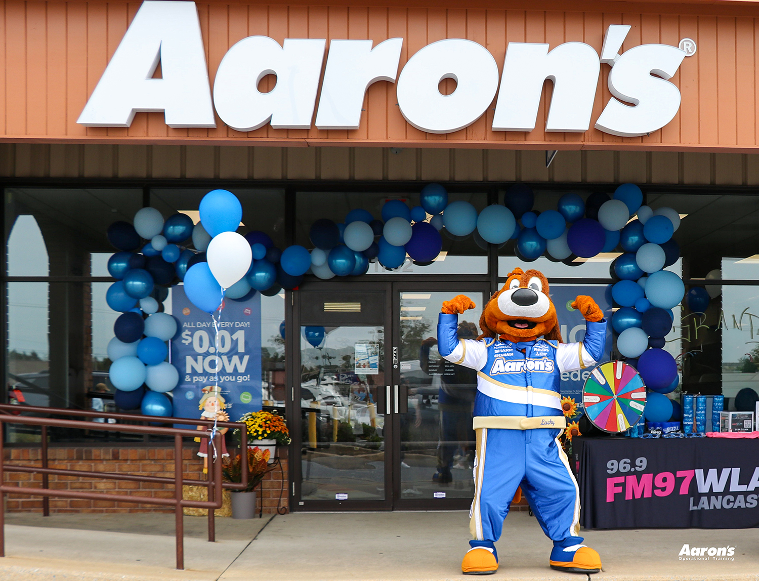 Lucky Dog greets visitors outside the newest Aaron’s location, owned and operated by CMH Leasing.