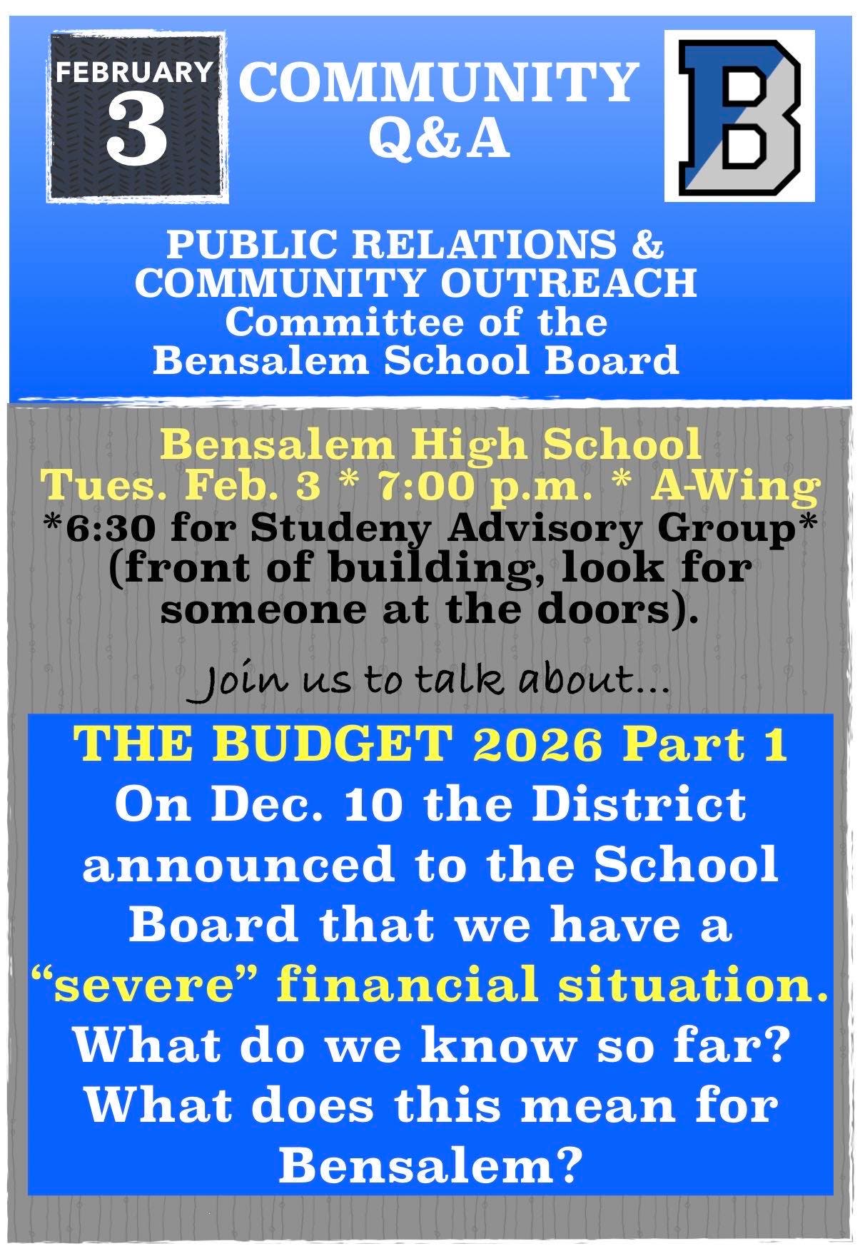 A Bensalem Township School Board committee will hold a public question and answer session on Tuesday night to try to provide residents answers to residents going into the school budget season.