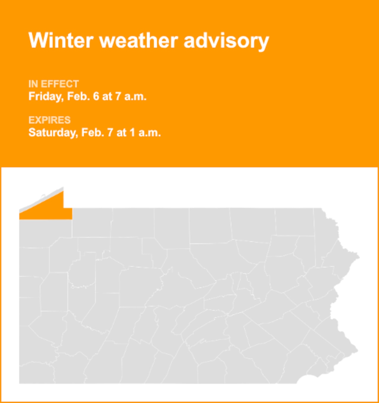 On Thursday at 1:04 p.m. a winter weather advisory was released by the National Weather Service valid from Friday 7 a.m. until Saturday 1 a.m. for Southern Erie.