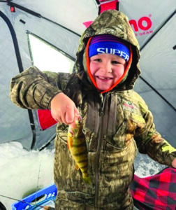 Happiness is: little 6-year-old Lucas Stearns, ice fishing with his dad, Major Stearn – a Chautauqua Lake ice fishing guide, caught his first-ever fish this week near Long Point on Chautauqua Lake.