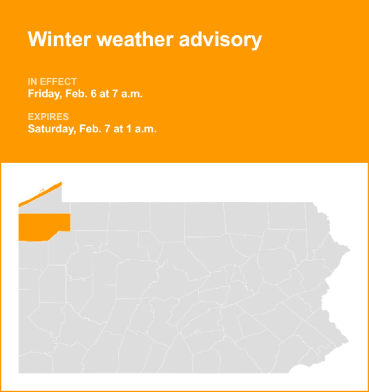 On Friday at 1:31 a.m. the National Weather Service issued a winter weather advisory valid from 7 a.m. until Saturday 1 a.m. for Northern Erie and Crawford County.