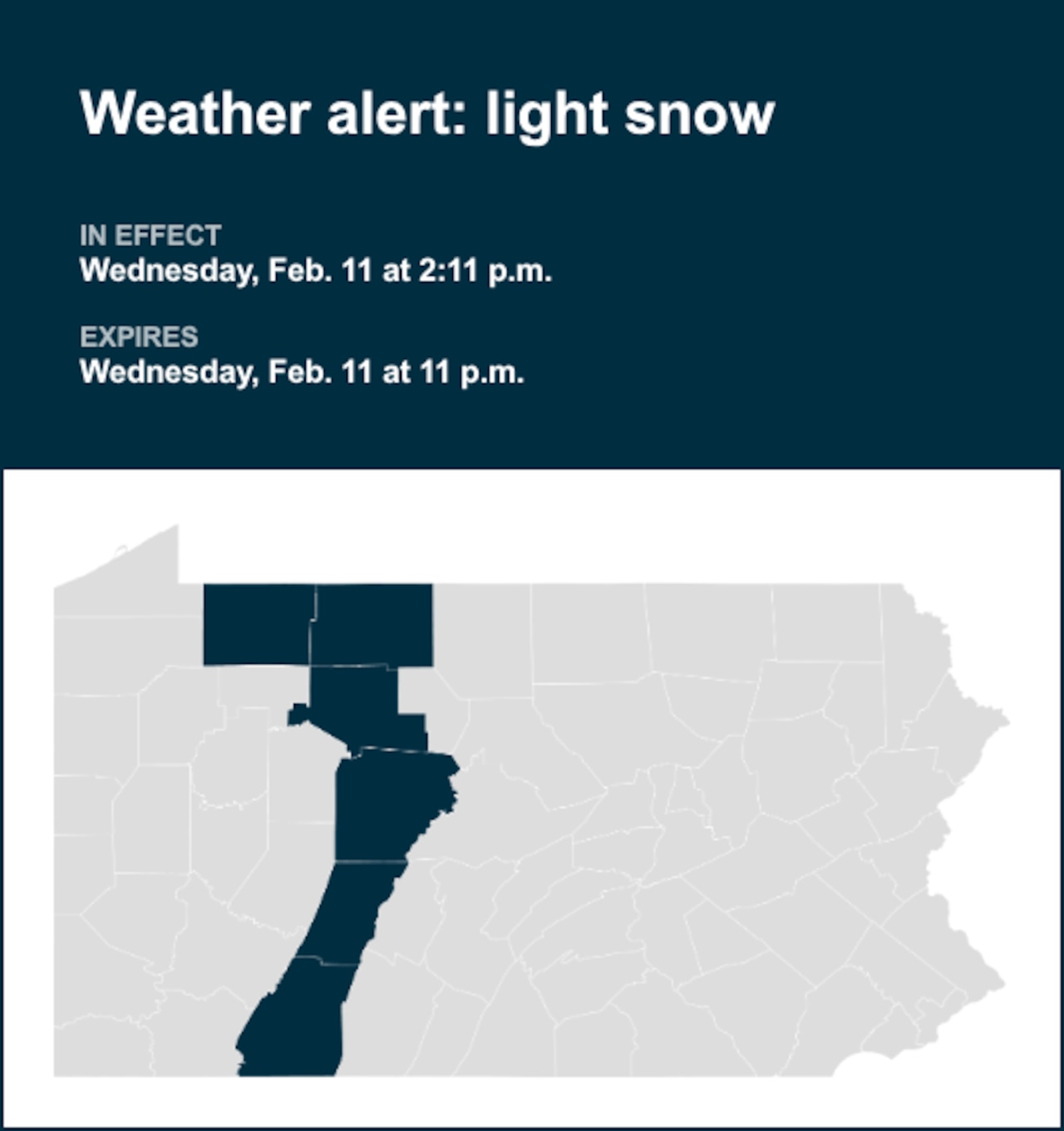 An updated report was issued from the National Weather Service on Wednesday at 2:11 p.m. for light snow until 11 p.m. for Warren, McKean, Elk, Clearfield, Cambria and Somerset counties.
