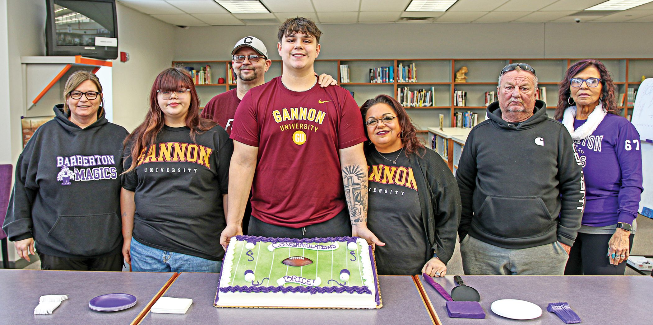 BARBERTON — Barberton High School (BHS) senior Brice Crowe signed to continue his academic and football career at Gannon University in Erie, Pa. Crowe was a four-year member of the BHS football program under head coach Tony Gotto. Crowe is shown with his family during his college signing in the BHS media center last week.