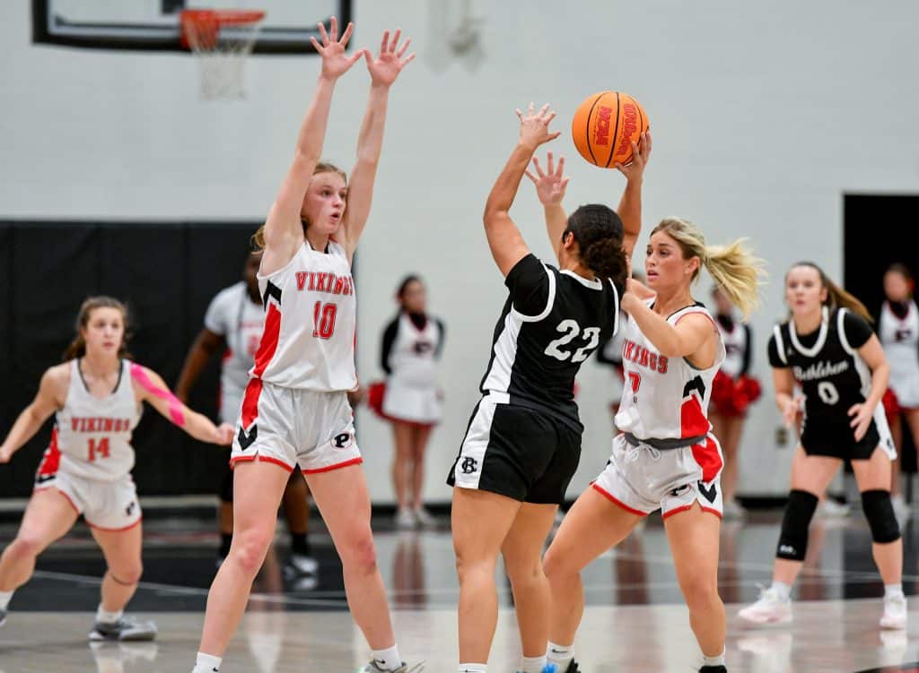 FPD defenders pressure Bethlehem Christian’s Titan Sapp (22) during the Vikings’ win over the Knights Tuesday night. Photo by Jason Vorhees / The Melody