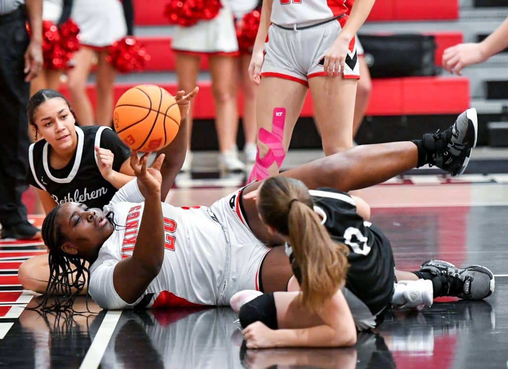 FPD’s Bri Crosby (20) attempts a to save the ball from going out of bounce during the Vikings’ first round GIAA playoff win over Bethlehem Christian Tuesday night. Photo by Jason Vorhees / The Melody