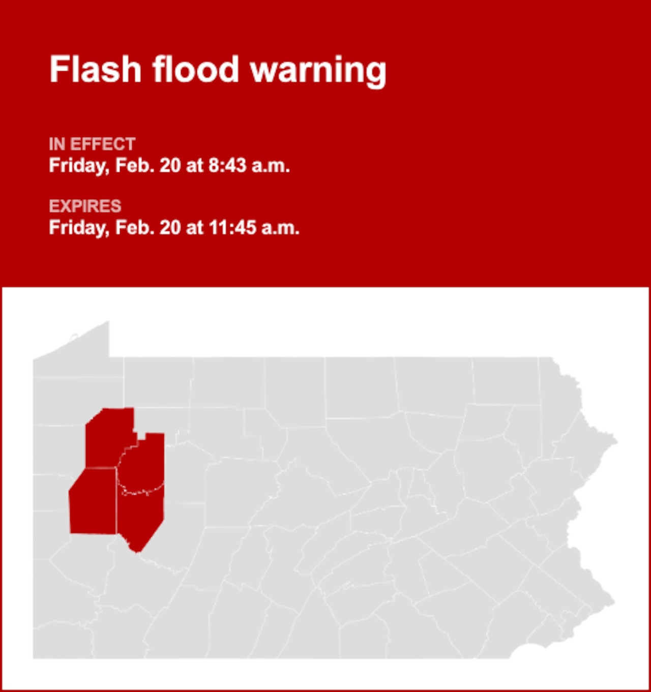 On Friday at 8:43 a.m. the National Weather Service issued a flash flood warning in effect until 11:45 a.m. for Armstrong, Butler, Clarion and Venango counties.