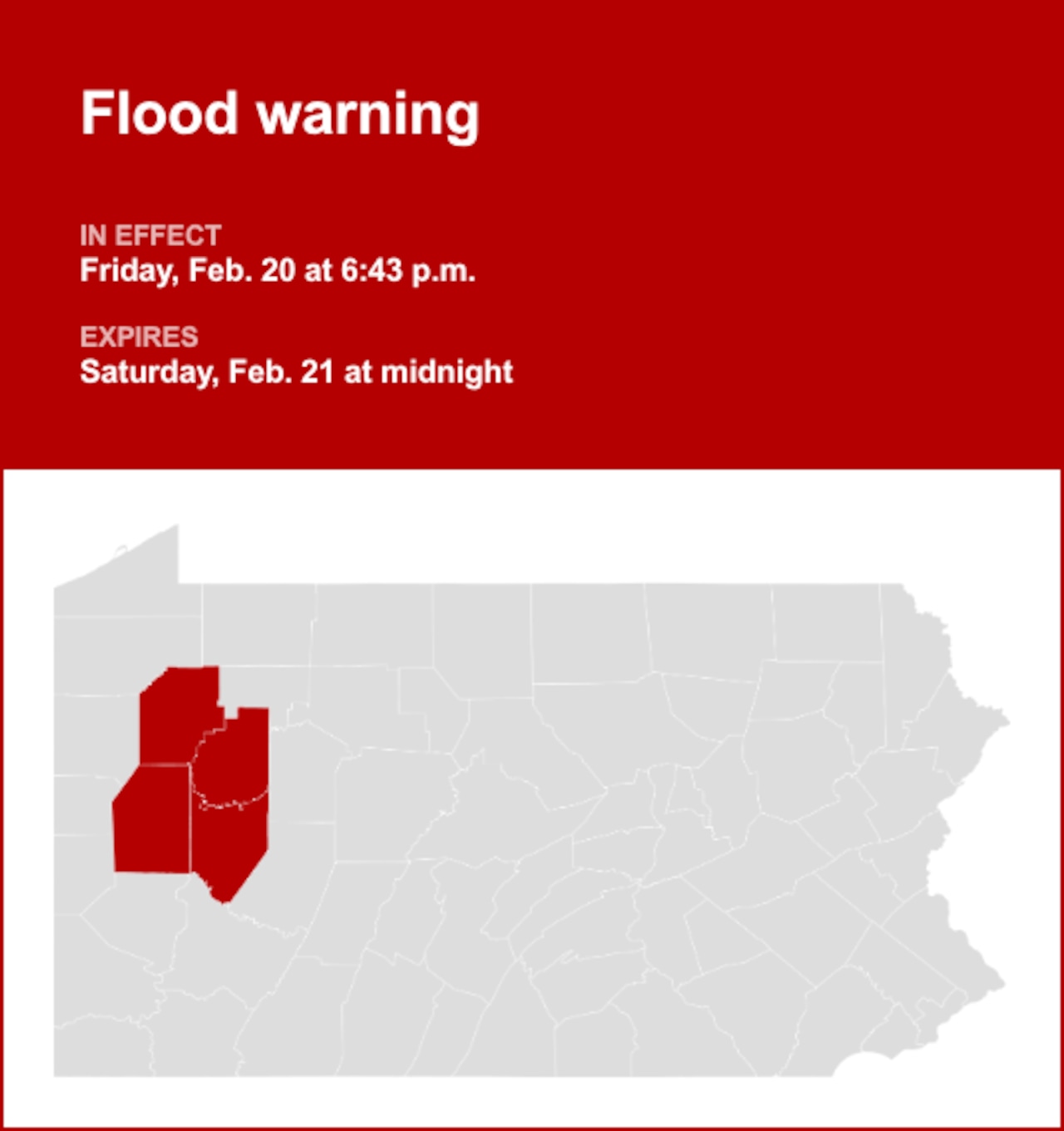 On Friday at 6:43 p.m. the National Weather Service issued a flood warning in effect until Saturday at midnight for Armstrong, Butler, Clarion and Venango counties.