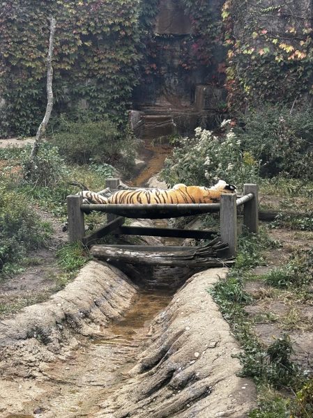 After a tiring morning of entertaining visitors, this tiger relaxes by lounging on her bed. The striking orange of her fur makes the black stripes pop. (Bailey Clements)