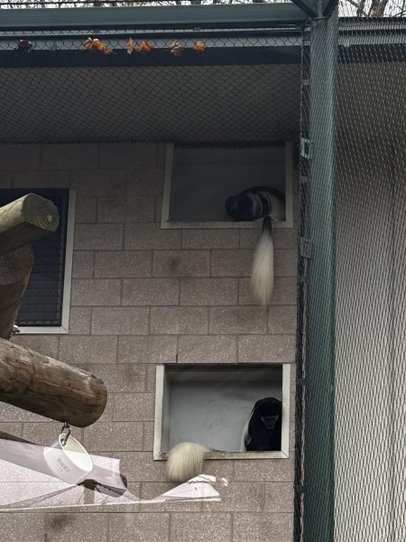 Here, we can spot two Colobus monkeys taking a break from playing, hiding away in their cubbies. This exhibit allows them to travel from inside to outside, giving them lots of room. (Bailey Clements)