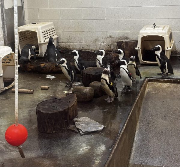 These playful penguins eagerly gather around, ready for their lunch. The zookeepers gave them cardboard rolls to keep them busy, but some started to snack on them instead. (Bailey Clements)