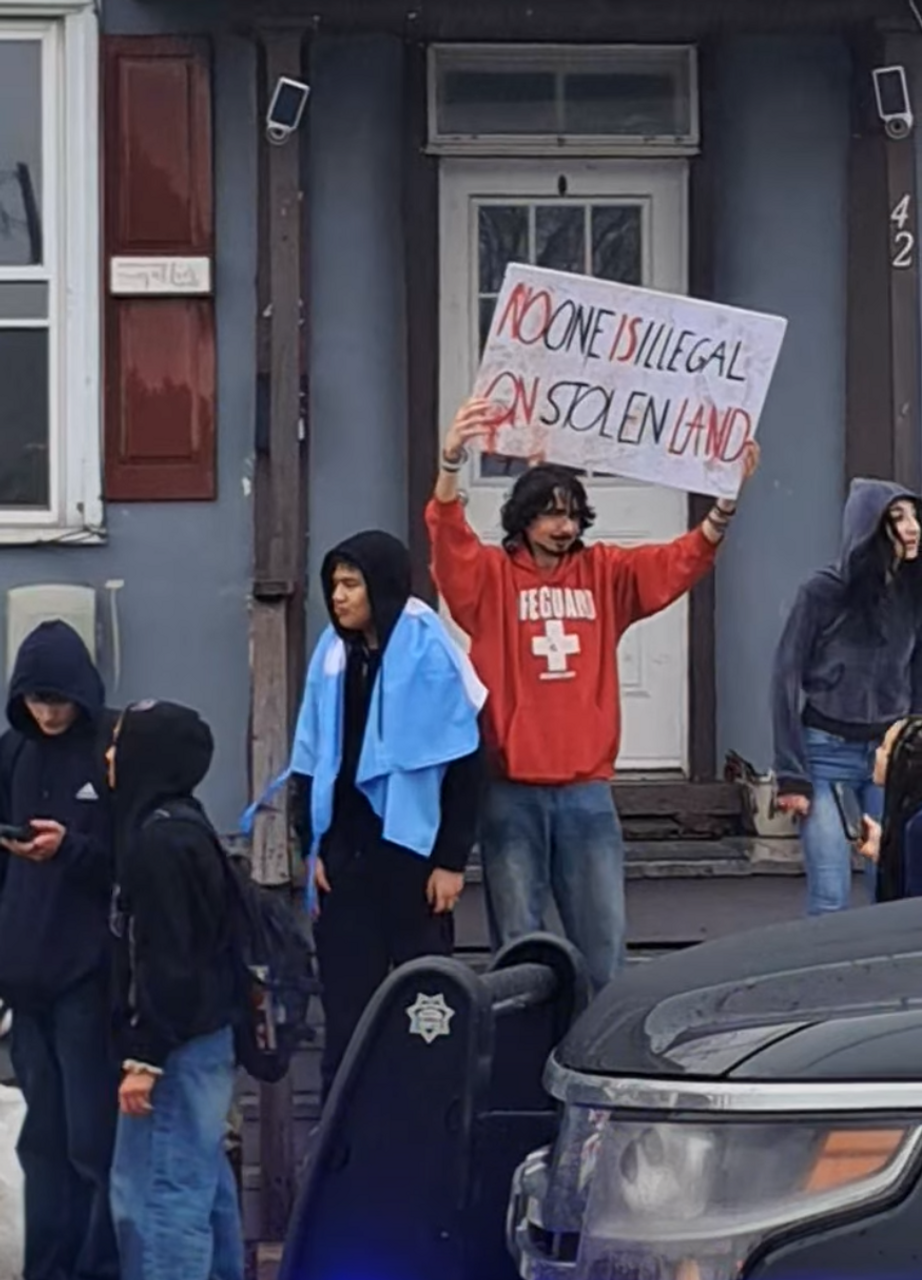 A student holds up a sign, now covered in blood, that reads: “No one is illegal on stolen land,” Quakertown, Pennsylvania. [Photo: David Stubanas]