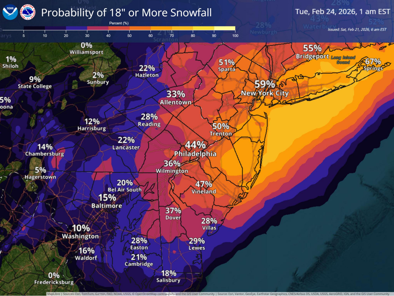 According to forecasters, southeastern Pennsylvania will see the heaviest snowfall Sunday night into Monday morning. Philadelphia has a 44 percent chance of recording more than 18 inches of snow, with the likelihood increasing northeast of the city.