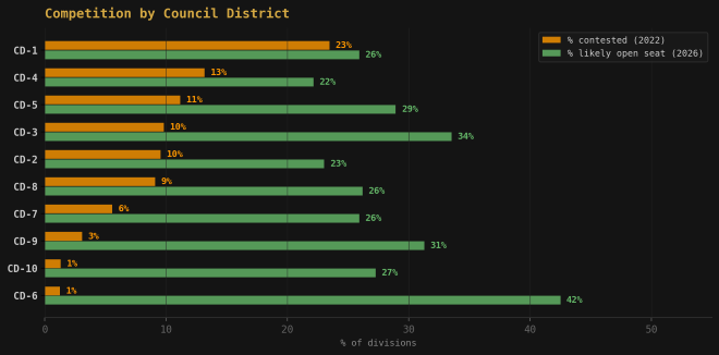 Perhaps unsurprisingly, the 1st Council District, which includes a lot of wealthier and gentrifying areas, had the highest share of competitive elections, with average levels of committeeperson turnover since 2027. Twenty-three percent of the divisions had contested races there. The next most competitive district was the 4th, with 13 percent of divisions seeing contested races, and the lowest turnover percentage of the 10 Council districts.