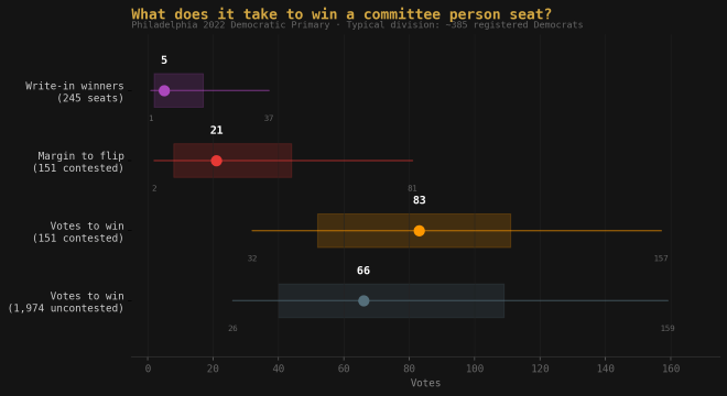 In both contested and uncontested divisions alike, only about 18 to 19 percent of registered Democratic voters in the median division even vote in the committeeperson elections. But the typical Philadelphia voting division has about 385 registered Democrats, and people are winning these races with less than 100 votes.